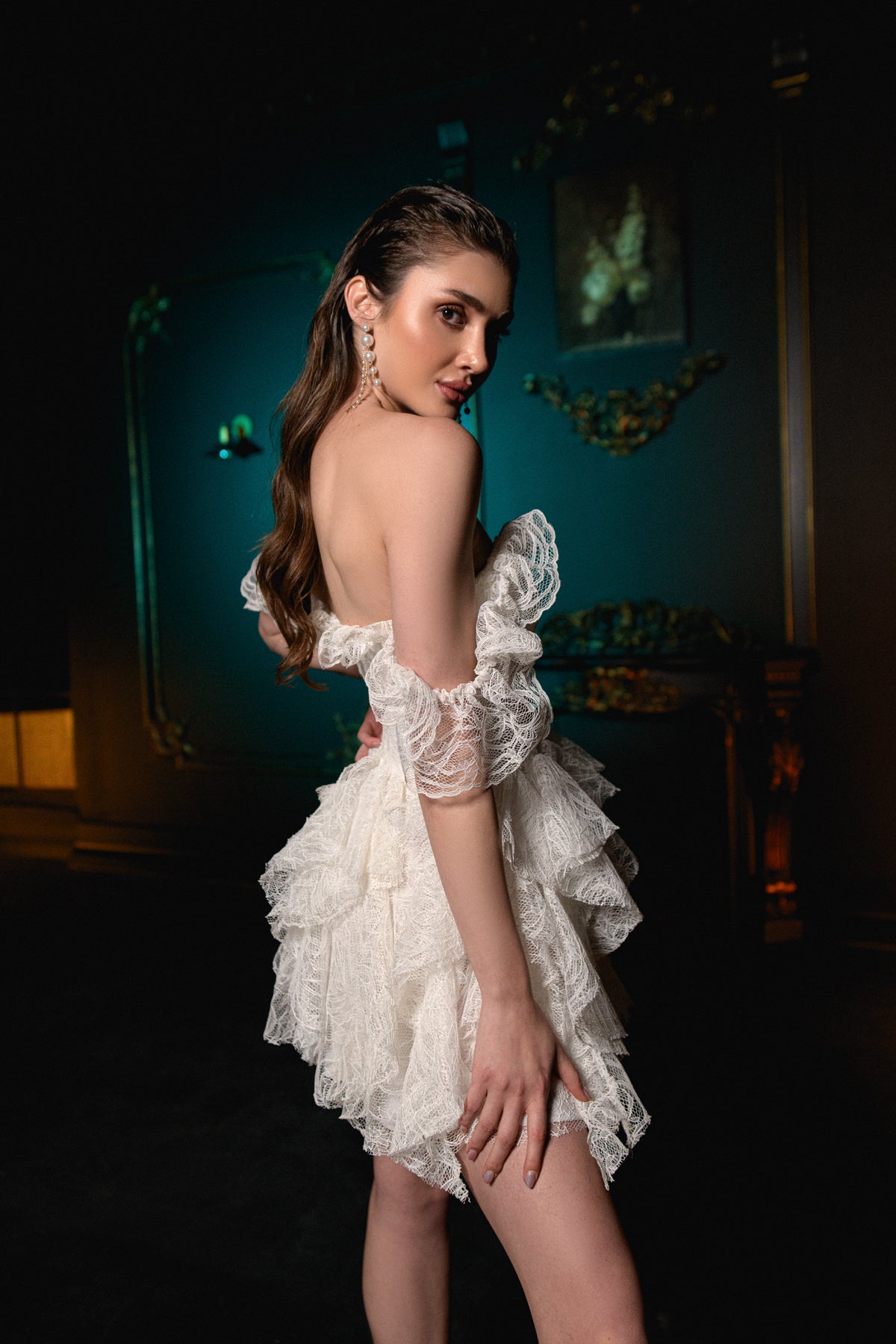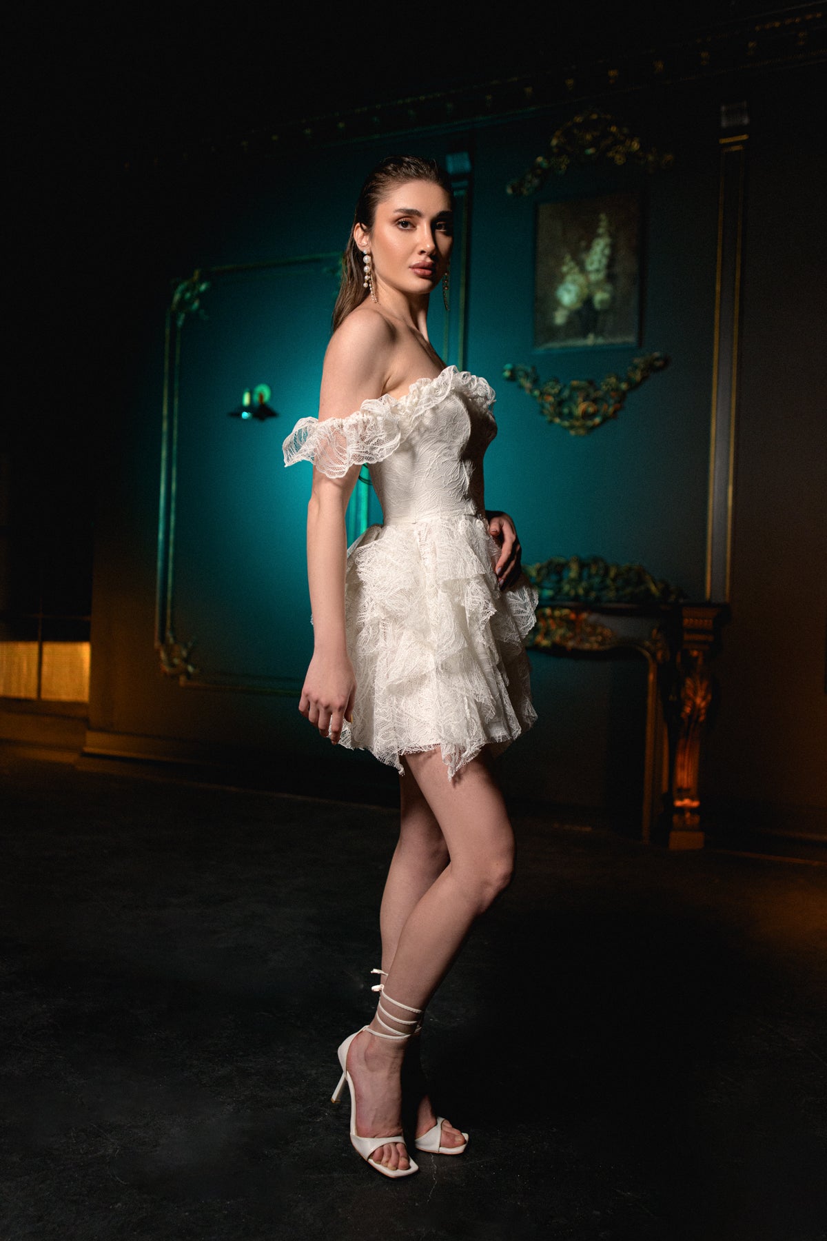 Parlak beyaz payetli dantel yüzey ile göz alıcı görünüm