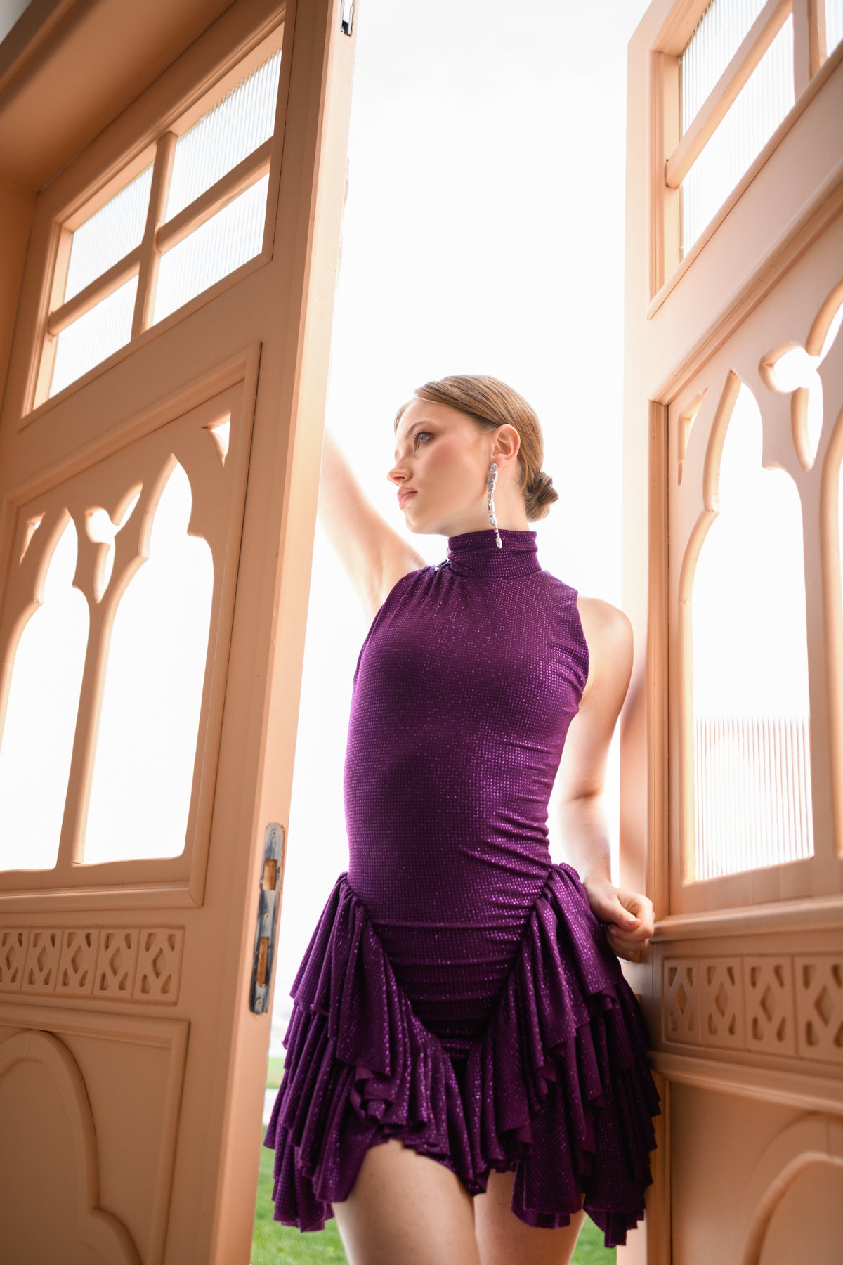 Geceyi parlatmak ve şıklığınızı bir üst seviyeye taşımak için mükemmel bir seçim! Mor simli boğazlı kolsuz volan detaylı mini elbise, ışıltılı simli kumaşı ve zarif volan detaylarıyla kusursuz bir görünüm sunuyor. Morun büyüleyici derinliği, gece ışıklarında parlayarak göz alıcı bir etki yaratırken, boğazlı kesim ve kolsuz tasarım, elbiseye modern ve şık bir hava katıyor.