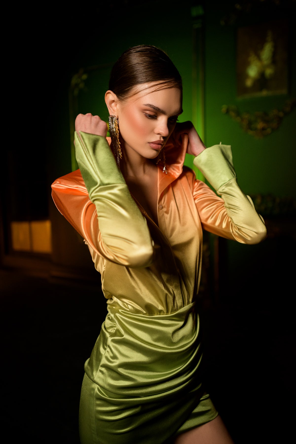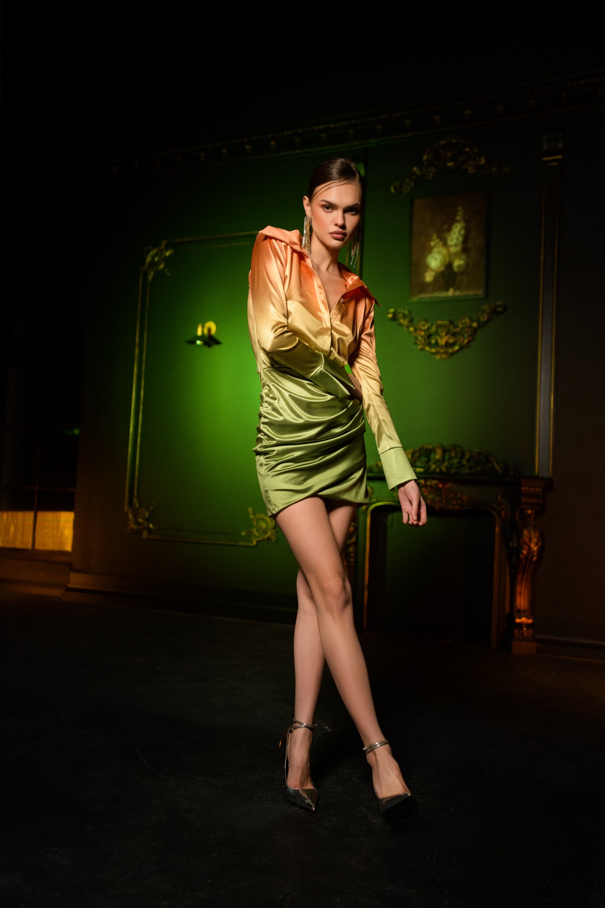 Turuncu Yeşil Degrade Saten Gömlek Elbise